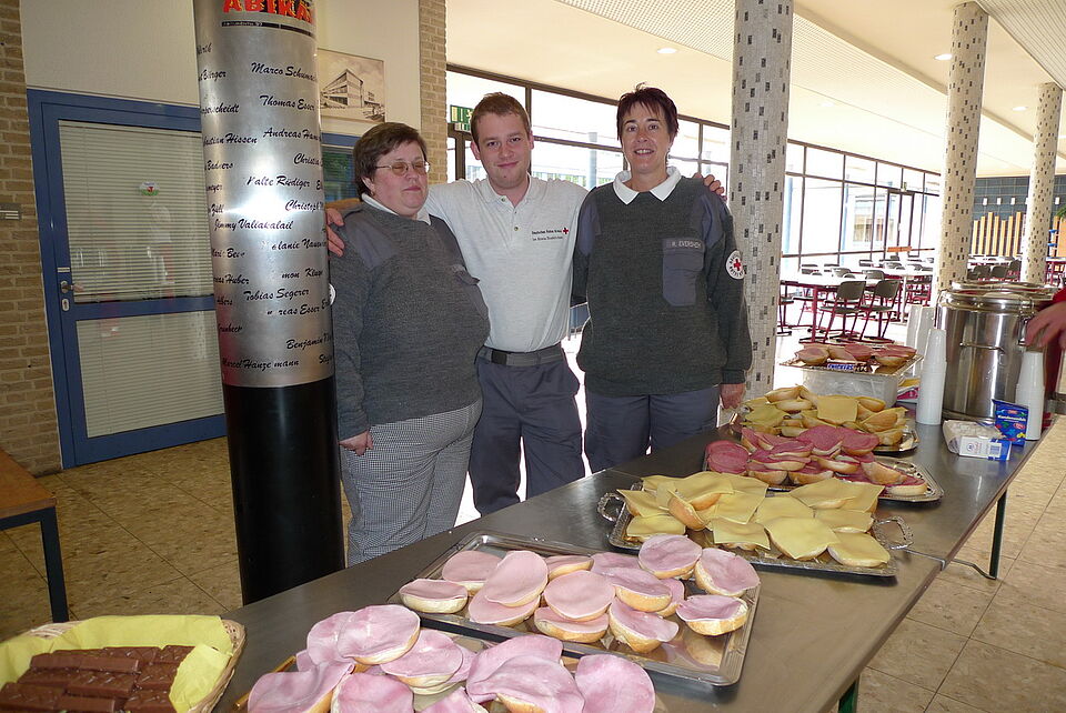 Bild DRK ZR | Um die Verpflegung braucht man sich beim Roten Kreuz keine Sorgen zu machen. Die ist immer gesichert. Diesmal versorgt die Zülpicher Betreuungsgruppe um Gaby Weinand (l) sogar zwei Veranstaltungen gleichzeitig. Neben dem Erste Hilfe-Wettbewerb mit mehr als 100 Teilnehmern und Mitgliedern im Organisationsteam werden auch die Einsatzgruppen auf der Euskirchener Maikirmes verpflegt.