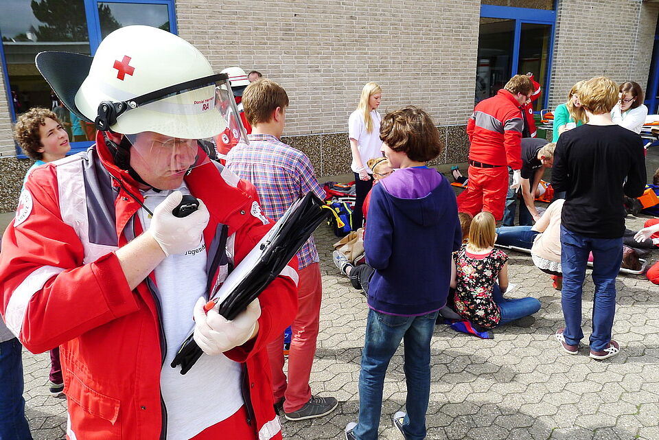 Fünf Verletzte und mehrere schockierte Mitschülerinnen auf dem Schulhof des Gymnasiums am Turmhof in Mechernich. Da werden die Freiwilligen der Schulsanitätsdienste ernsthaft gefordert.