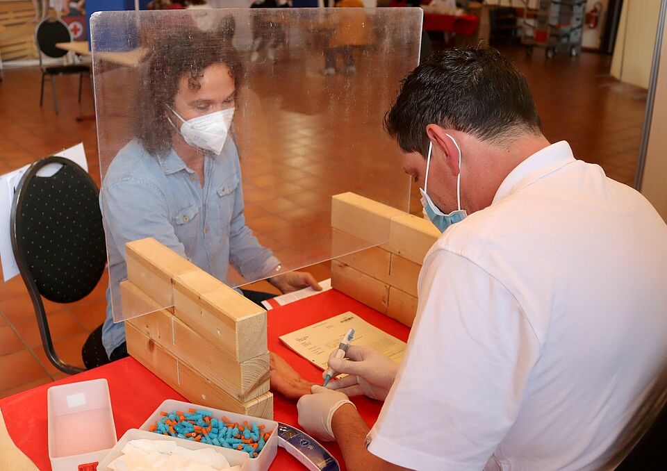Stephan Brings war einer von 132 Menschen, die in Kommern einen halben Liter Blut spendeten. „Wir freuen uns sehr, dass die Zahl der Spender hier in Kommern auch durch Corona nicht gesunken ist“, sagte Kreisgeschäftsführer Rolf Klöcker in seiner Funktion als Mechernicher Ortsvereinsvorsitzender. Auch vor Corona lag die Zahl meist bei um die 130 Spender. „Ich bedanke mich ausdrücklich bei den Blutspendern für ihre Treue und dass sie, trotz der in Corona-Zeiten schon einmal längeren Wartezeit, regelmäßig ihren wichtigen Lebenssaft zur Verfügung stellen“, sagte Klöcker.