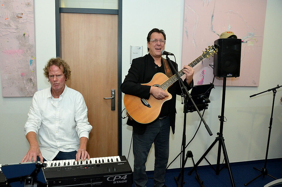 Musikalisch begleitet wurde die Vernissage von Uli van Staa (Klavier) und Pete Bauchwitz (Gitarre und Gesang). Letzterer macht bereits seit über 50 Jahren Musik, hat mit sämtlichen großen „Big Bands“ des Landes gearbeitet, war bei zahlreichen bekannten Jingles mit dabei und sogar sieben Jahre lang bei den Kult-Kölner „Höhnern“. Bauchwitz und van Staa spielten beeindruckend authentisch Jazz, Swing und die Lieder Frank Sinatras.