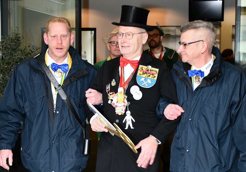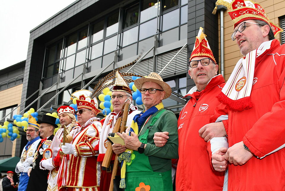 Rasch schwenkte der in über 20 Bürgermeister-Jahren kampferprobte Dr. Hans-Peter Schick die weiße Fahne und ließ sich von Mechernicher Prinzengardisten bereitwillig vor dem Rathaus auf den Pranger führen, den Beigeordneten Thomas Hambach im Robin-Hood-Gewand und den als Gärtner verkleideten Dezernenten Ralf Claßen im Schlepptau.