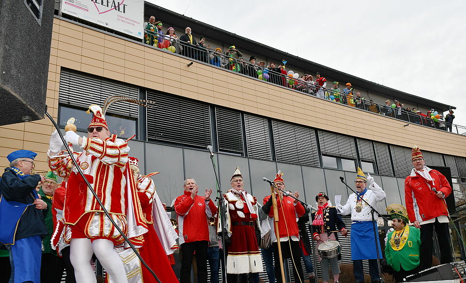 Bereits der dritte wassergefüllte Luftballon, den der Erste Beigeordnete und stellvertretende Verwaltungschef von der Rathausbrüstung auf die angreifenden Karnevalsjecken schleuderte, traf das Mischpult der Lautsprecheranlage und schaltete alle Mikrophone stumm. So erfuhren die närrischen Zaungäste nur noch rudimentär, was ihnen die von Karl „Charly“ Theißen (Prinzengarde Mechernich) und Ralf Schumann (KV Vussem von 1977) angefeuerten Fastelovends-Enthusiasten zu sagen hatten.