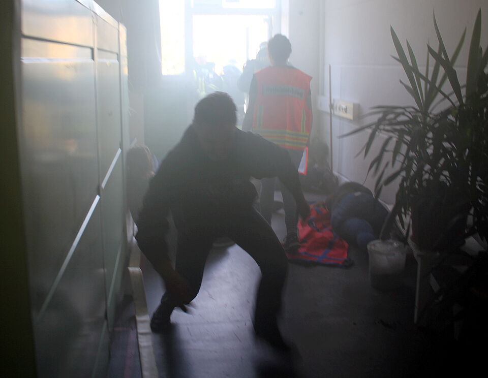 Dank der Nebelmaschine der Feuerwehr Euskirchen qualmte es ordentlich aus den Bürofenstern im Obergeschoss. Dieser Trakt war so verraucht, dass man die Hand vor Augen nicht sehen konnte. Dutzende Freiwillige harrten in dem Disco-Nebel aus, um zu Übungszwecken gerettet zu werden. Die insgesamt 71 „Verletzten“ stammten unter anderem vom Roten Kreuz und der Feuerwehr. Von 9 Uhr an wurden sie geschminkt und auf den Ernstfall vorbereitet.