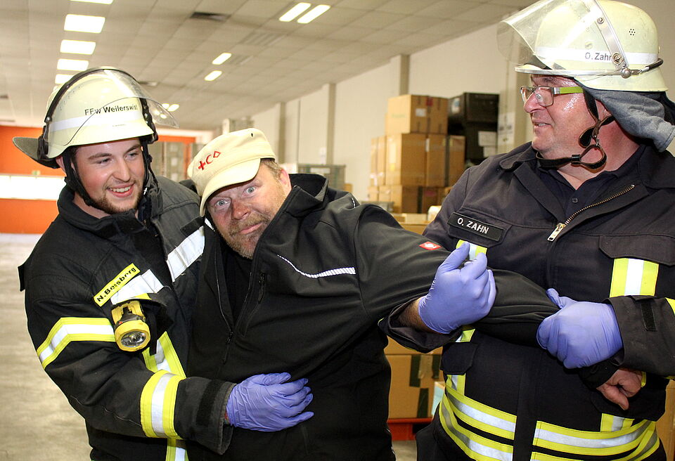 Einige lagen in der Halle zwischen Kartons, andere spielten, als seien sie in einem Schockzustand und liefen auch nach ihrer Rettung ständig zurück in die Einsatzstelle – oder ließen sich gar nicht erst nach draußen geleiten und waren renitent, wie Sascha Suijkerland von der DRK-Bereitschaft Mechernich. „Ich hatte heute Morgen beim Aufstehen schon so ein dummes Gefühl“, brüllte er und hatte sichtlich Freude an seiner Rolle. In Ruhe gelassen wolle er werden, sein Mittagessen genießen, dass ihm bei der Explosion um die Ohren geflogen war.