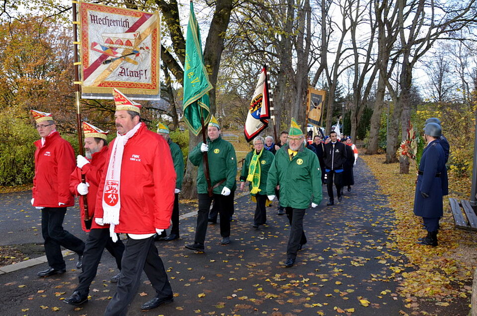 Foto: Manfred Lang/pp/Agentur ProfiPress | Beim Einbiegen vom Ehrenfriedhof zum Ehrenmal Mechernich: Die Abordnungen des Festausschusses Mechernicher Karneval um Albert Meyer (vorne rechts) und des KC „Bleifööss“ um seinen Präsidenten Reinhard Kijewski (dahinter rechts in Grün).