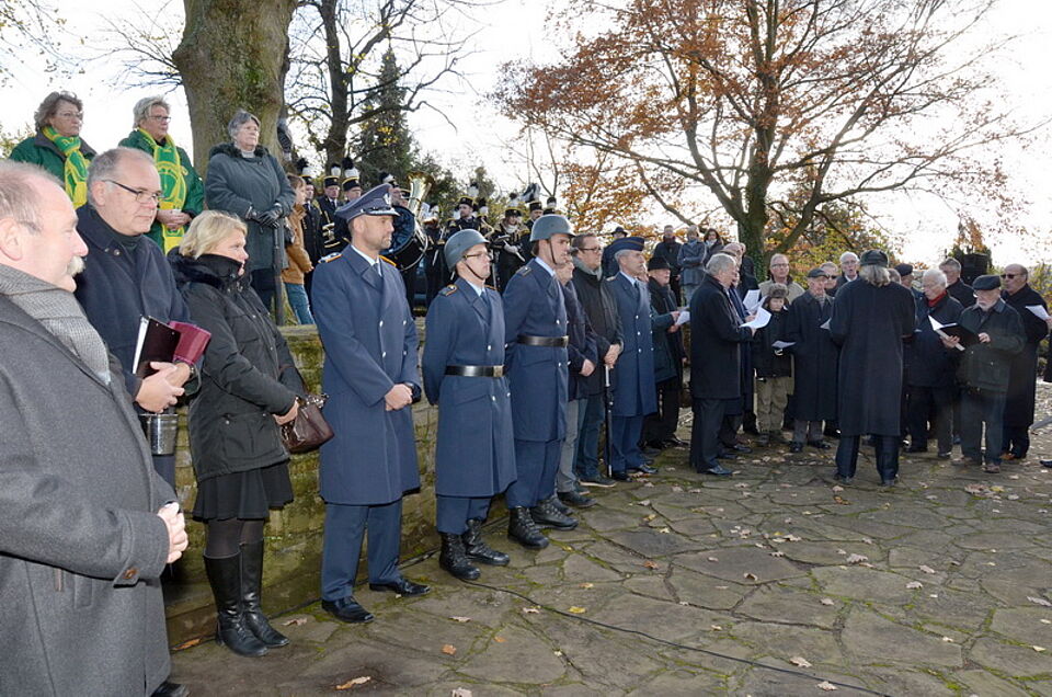 Foto: Manfred Lang/pp/Agentur ProfiPress | Ehrenkomitee und der Männergesangverein Mechernich unter seinem Dirigenten Gerhard Half haben am Ehrenmal Position bezogen.