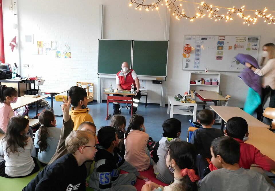 An der von Uli Lindner-Moog geleiteten Grundschule Mechernich lasen unter anderem auch Rotkreuz-Gemeinschaftsleiter Sascha Suijkerland, Kinderchefarzt Dr. Herbert Schade, Ex-Rektorin und Mechernich-Stiftung-Funktionärin Rita Gerdemann, die Polizeibeamtin Lara Mertens und GAT-Direktor Mischa Kreitz.