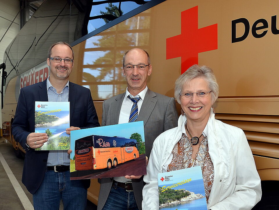 Jetzt stellten die Busunternehmer Rolf Schäfer und Guido Bauer gemeinsam mit Rotkreuz-Kreisgeschäftsführer Rolf Klöcker und der DRK-Servicereisebeauftragten Monika Dormagen einen neu dekorierten Fernreisebus vor, der ab sofort für das Servicereiseprogramm des Roten Kreuzes im Kreis Euskirchen sowie für das Bundeswehr-Sozialwerk Werbung macht.