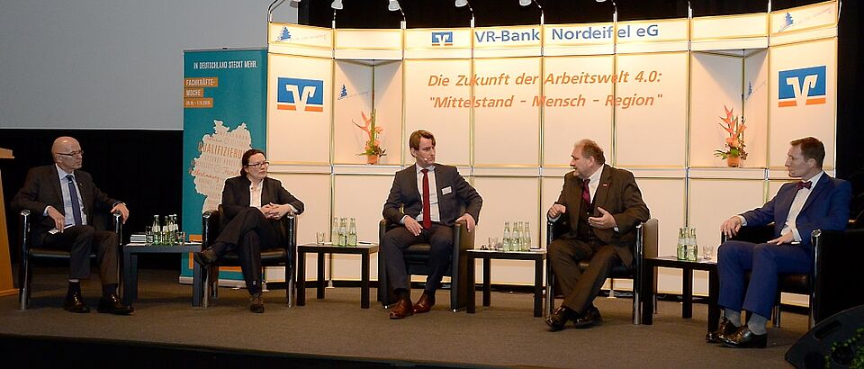 Bevor die Ministerin und VR-Bank-Vorstandsvorsitzender Bernd Altgen sich mit Hans Peter Wollseifer, dem Präsidenten des Zentralverbandes Deutsches Handwerk, Michael F. Bayer, dem Hauptgeschäftsführer der Industrie-und Handelskammer zu Aachen, und mit Moderator Frank Hauser, dem Geschäftsführer des Instituts „Great Place To Work“ aus Köln, zur Podiumsdiskussion zusammensetzten, gab es noch eine hohe Auszeichnung des Ministeriums zu vergeben.