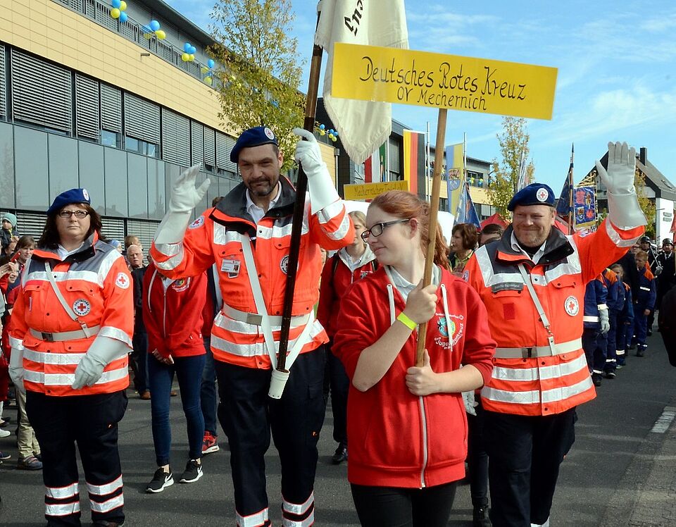 Dort hatte das Mechernicher Stadtjubiläum am Freitagabend mit einem Festakt begonnen. Der Samstag nahm mit einem Festzug aus über 600 Teilnehmern seinen Auftakt, darunter auch eine Fahnenabordnung, Bereitschaft und Jugendrotkreuz des von Kreisgeschäftsführer Rolf Klöcker ehrenamtlich geführten DRK-Ortsvereines Mechernich.