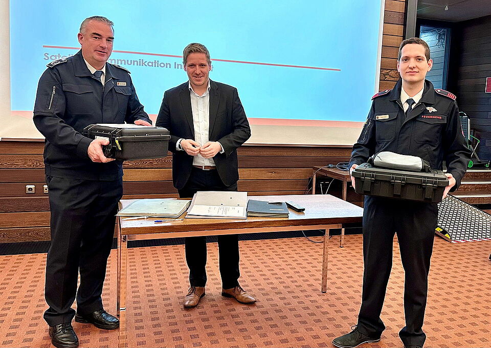 Letzter Baustein im Konzept seien nun die hochmodernen Satellitentelefone auf „Inmarsat“-Basis, die nun ebenfalls an die Städte und Gemeinden sowie an die Hilfsorganisationen DRK, MHD, THW und DLRG sowie die Polizei übergeben wurden. Das Gesamtpaket hat einen Anschaffungswert von rund 100.000 Euro – Geld, das vom Kreistag für den Bevölkerungsschutz einstimmig bewilligt worden war.