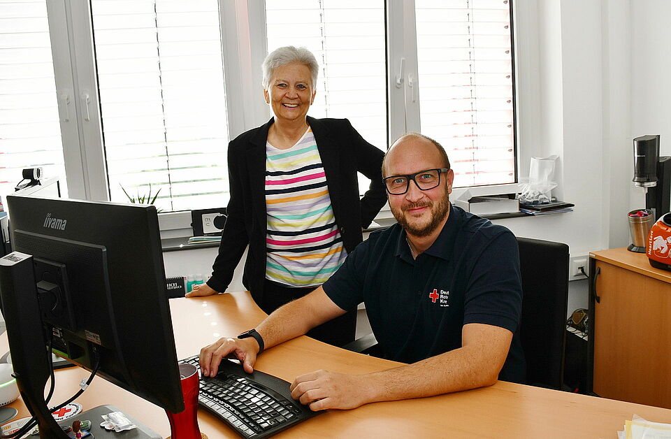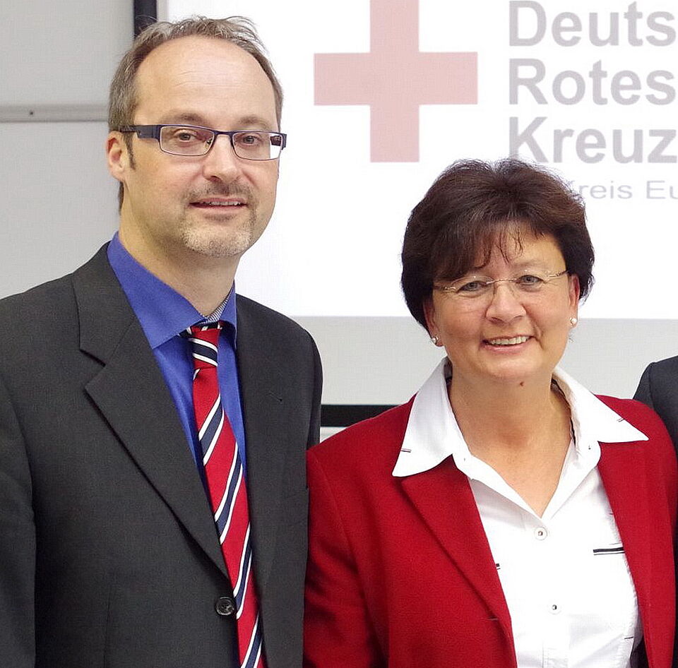 Warfen im Pressegespräch einen Blick zurück auf 25 Jahre Bildungsarbeit beim Roten Kreuz im Kreis Euskirchen: Ilona Raabe und Patrick Dost. Foto: Manfred Lang/pp/Agentur ProfiPress
