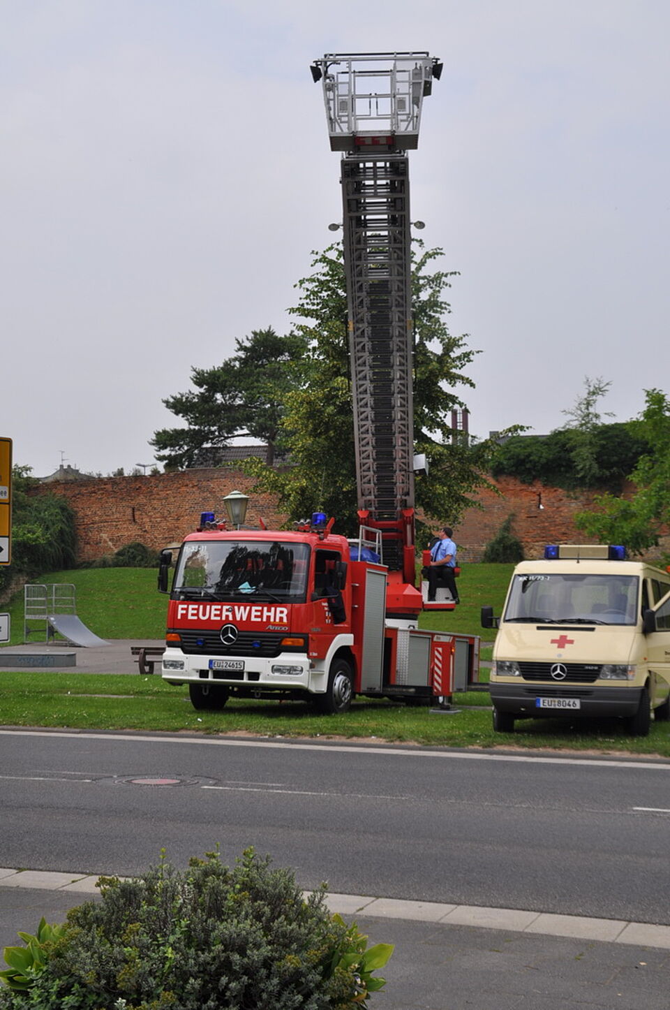 Einer der Höhepunkte für das neue Brautpaar dürfte sicherlich der Ausblick auf die Römerstadt aus gut 25 Metern Höhe gewesen sein. Denn die Kameraden der Feuerwehr luden sie zur Ausfahrt mit der Drehleiter durch die Römerstadt ein - unter dem Beifall der Hochzeitsgäste ging es für die beiden zum ersten Mal hoch hinaus.