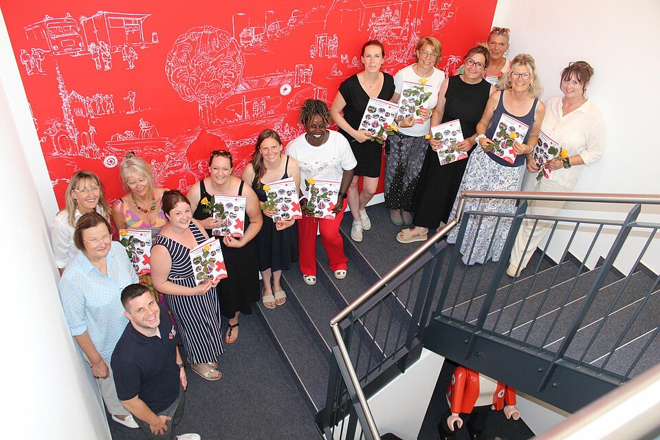 Euskirchen - Examinierte Kinderpflegerinnen wollten sie werden. – Das hat geklappt. Alle elf Teilnehmerinnen des gleichnamigen DRK-Vorbereitungskurses haben die externe Prüfung zur Kinderpflegerin erfolgreich bestanden. Überglücklich durften die Kitakräfte nun genau dort ihre Zeugnisse in Empfang nehmen, wo sie seit September letzten Jahres immer dienstags und samstags fleißig gebüffelt haben: Im Rotkreuzzentrum in Euskirchen. Mit den elf Kita-Mitarbeiterinnen, die bislang als Unterstützungskräfte oder Helferinnen eingesetzt waren, freuten sich nicht nur die Verantwortlichen der DRK-Bildungsakademie, Daniel Larres und Heike Iven. Ausbilderin Maria Ben Jannet war besonders gerührt, darf sie doch ab sofort mit einer flotten neuen Einkaufstasche shoppen gehen, liebevoll bestickt mit der Aufschrift „Dozentin mit Herz“.