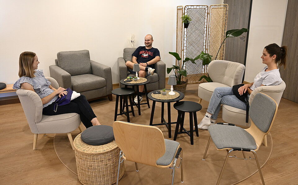 Während im Erdgeschoss drei Gruppen der drei- bis sechsjährigen Kinder Platz finden, befinden sich in der ersten Etage zwei U3-Gruppen mit jeweils einem Gruppen-, einem Neben- und einem Differenzierungsraum. Auch ein reizarmer Snoozel-Raum ist vorhanden, der den Kids Platz für ein Nickerchen oder einfache Abgeschiedenheit vom Kita-Trubel bietet. Doch auch für Eltern sowie Mitarbeiterinnen und Mitarbeiter bietet sie mit einer Lounge zu Begegnung, mehreren Küchen und einer großen Glasfassade mit einem wunderschönen Ausblick einigen Komfort.