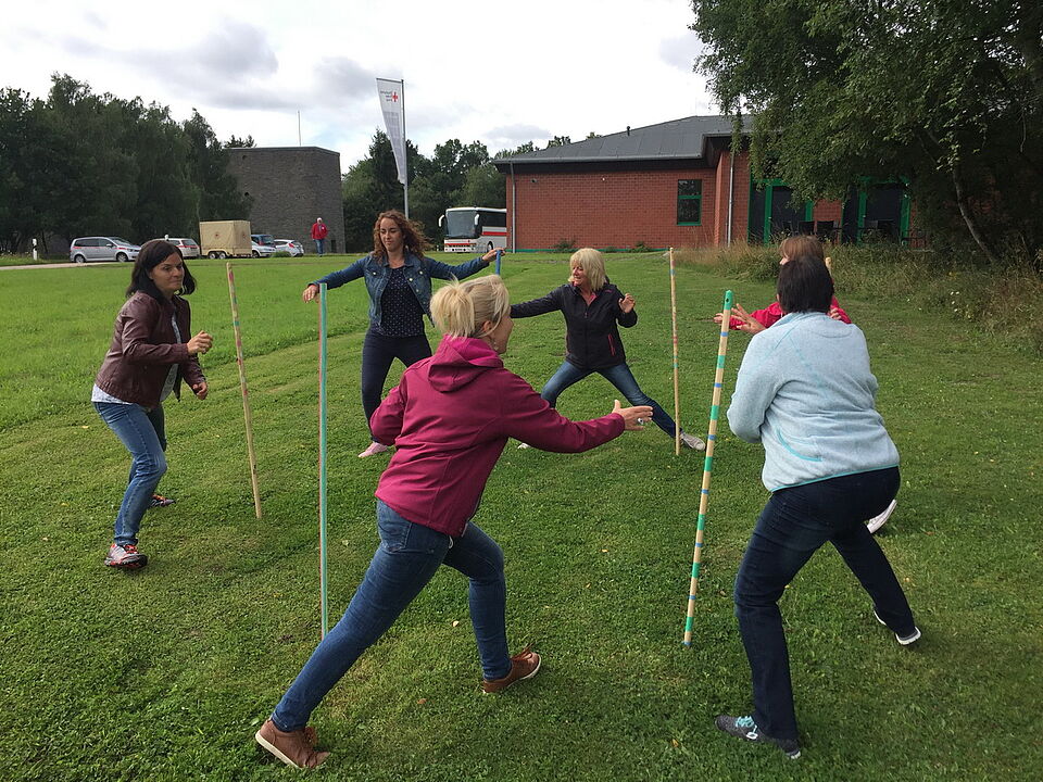 Nach einem informativen Einstieg mit Filmimpulsen über die Entstehung, die Entwicklung, sowie die heutige Arbeit des Roten Kreuzes weltweit, sind auf dem Rotkreuz FriedensPfad Eifel erlebnispädagogische Angebote durchgeführt worden, welche nicht nur als Ideenbasis für die eigene Einrichtung gedient haben, sondern darüber hinaus auch das Zusammengehörigkeitsgefühl als Team gefestigt und die Lachmuskeln trainiert haben.
