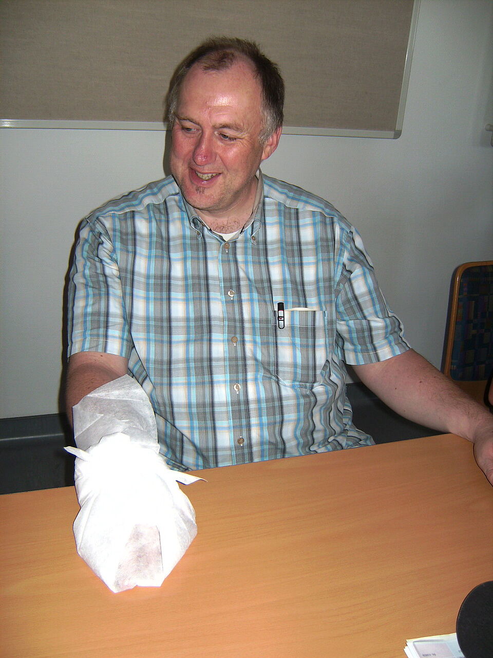 Zum Beispiel am Ambu-Man, einer Reanimationspuppe, dessen Brust im Sambarhythmus gepresst wird. Mit Verbänden hingegen wird an realen Personen herumgebastelt. Da scheint kurzzeitig keine neue Generation von Rotkreuzlern zu sitzen, sondern die Opfer einer Massenkarambolage. Die Tische sind mit Verbänden wie von einer Schneedecke bedeckt, ebenso Hände, Arme und Köpfe der Teilnehmer. Und mit einem Augenverband versehen entkommt auch niemand dem Vergnügen, sich von seinem Partner über das Gelände führen zu lassen. Eigentlich sollte es als Qualitätsmerkmal der Teilnehmer gelten, dass bei diesem Rundgang keine realen Wunden entstanden sind.