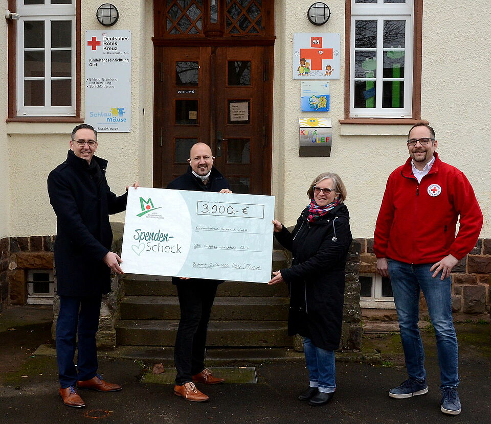 Mechernich – 3000 Euro hat die Geschäftsführung des Kreiskrankenhauses in Mechernich am Freitag, 4. Februar, an die DRK-Kita in Schleiden-Olef übergeben. Vor Ort waren neben den KKH-Geschäftsführern Martin Milde und Thorsten Schütze auch die Kita-Einrichtungsleitung Petra Kessel und Ralf Krutwig, zuständiger Bereichsleiter für DRK-Kitas im Kreisverband Euskirchen.
