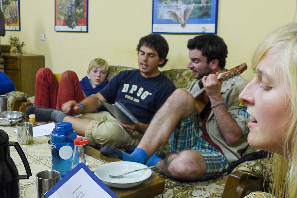 Schnell war ein Feuer im Kamin angezündet und die gute Laune kehrte wider ein. Aber da waren noch drei andere Gruppen. Sie waren schon weiter auf dem Weg nach Wolfgarten unterwegs.