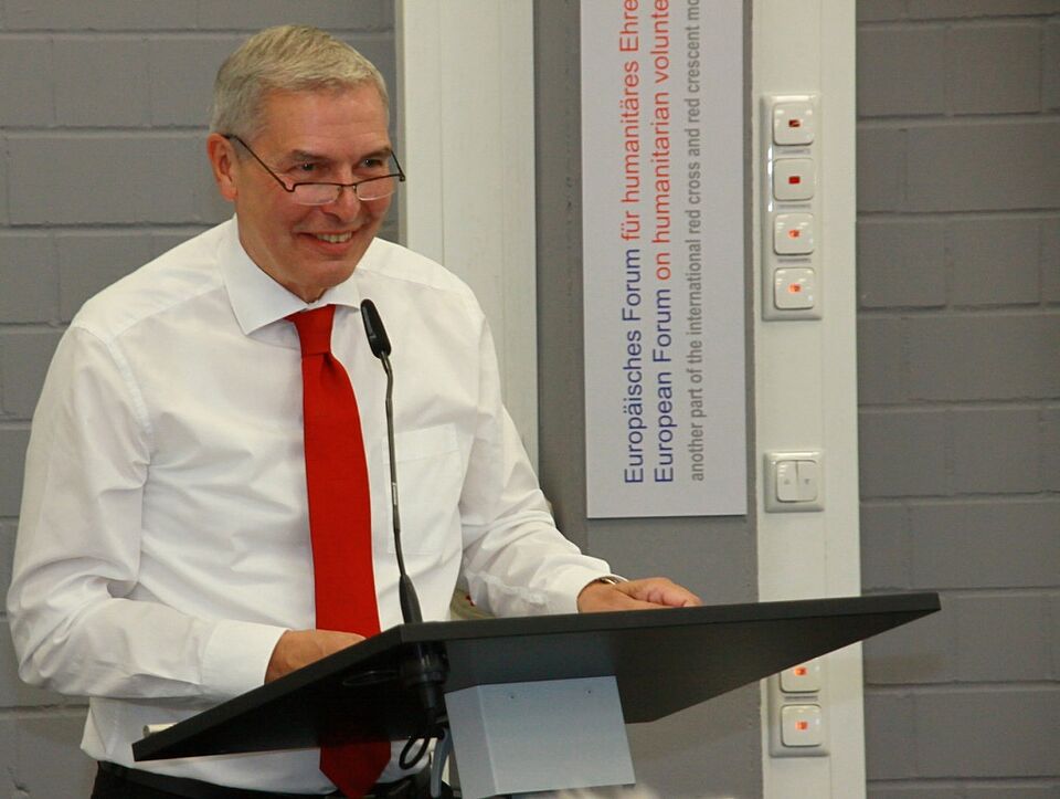 Ausgestattet mit der roten DRK-Krawatte von Rolf Zimmermann, lobte Schleidens Bürgermeister und DRK-Vorstandsmitglied Udo Meister das ehrenamtliche Engagement der Helfer. „Das Ehrenamt ist die Lebensader der Kommunen“, führte er aus, ohne seien sie nicht lebensfähig. Das DRK sei mittlerweile der aktivste Partner auf Vogelsang, das mit der neuen Akademie wieder einen Baustein mehr hier vorzuweisen habe.
