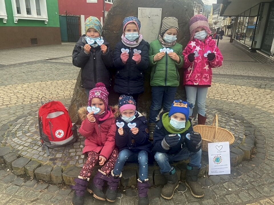 Die Kinder machten sich in Kleingruppen mit jeweils zwei Erzieherinnen auf den Weg vom Gemünder Kurpark bis in die Fußgängerzone und verteilten an alle Personen, die ihnen unterwegs begegneten, aber auch in den Geschäften kleine Herzen, die im Vorfeld in der Kita gebastelt wurden. Auf den Herzen stand: „Miteinander geht nur zusammen.“