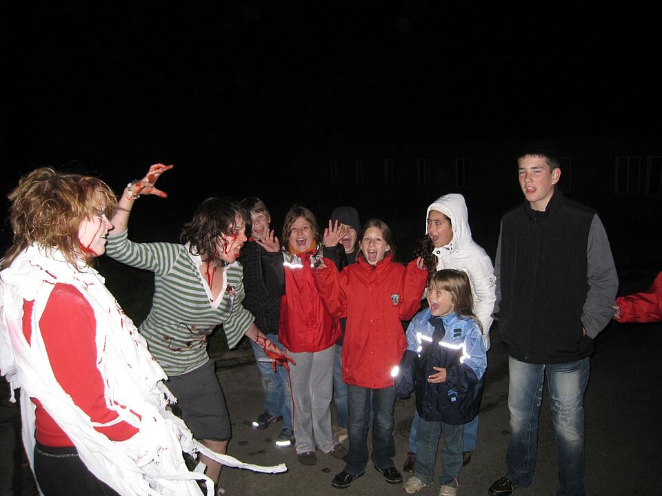 Laura und Anna hatten sich extra "schick" gemacht, um die Gruppe zu erschrecken. Angesichts dieser Situation zeigten die Rotkreuz-Kids ihre Lagererfahrung und brachten es fertig, den Spieß umzudrehen und den beiden Verkleideten einen gehörigen Schrecken einzujagen.