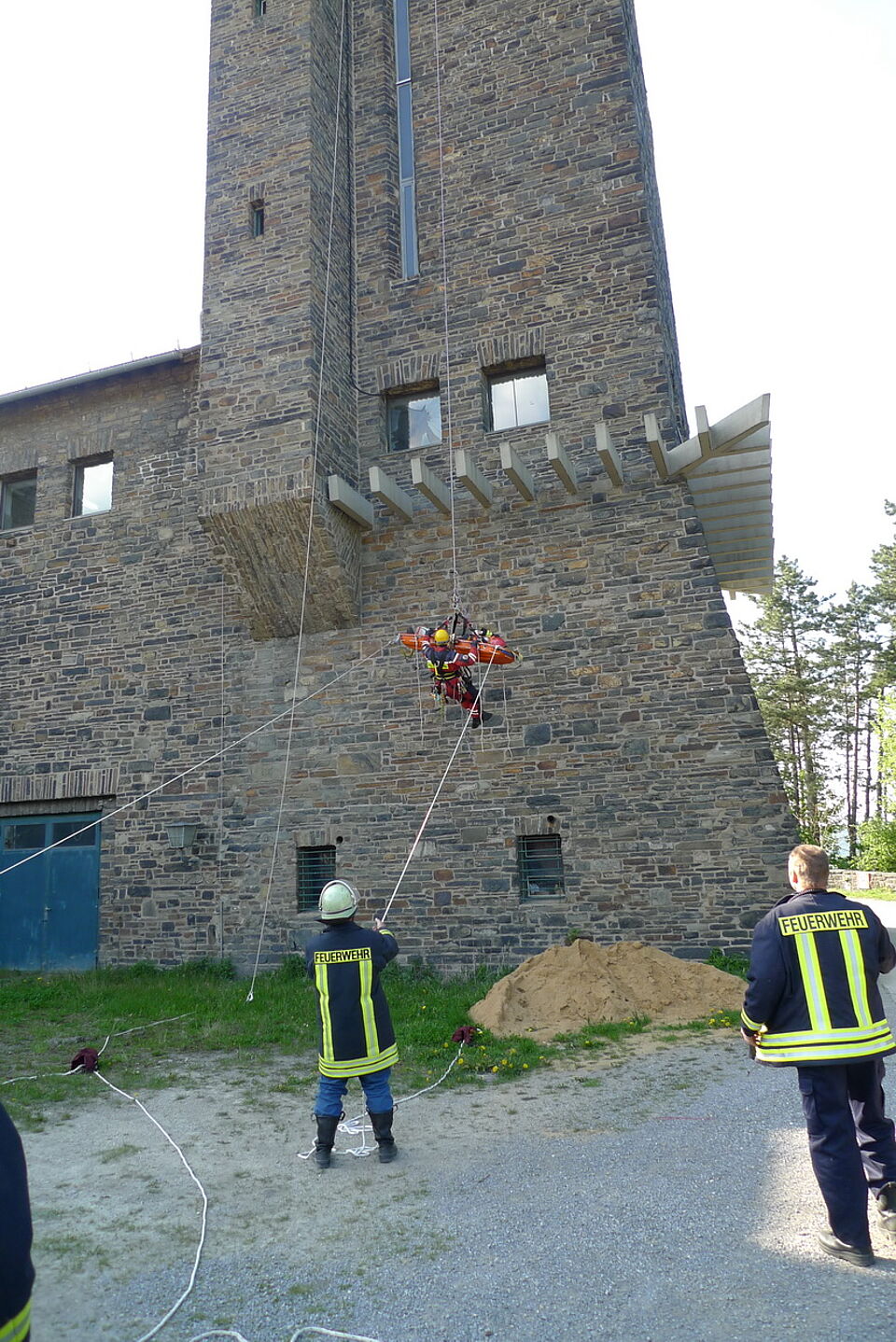 Schnell war klar, dass nur eine Rettung durch Abseilen an der Außenwand des Turmes in Frage kam (genau diese Maßnahme hatte eine Gruppe der Rotkreuz -Bergwacht aus dem Kreis Euskirchen im November 2008 am Turm geübt). Die Brüstung des Turmes hat eine Höhe von 43 Metern und die Drehleiter der Feuerwehr aus Schleiden erreicht nur etwa 25 Meter. Ein Transport durch die enge und steile Wendeltreppe war nicht möglich.