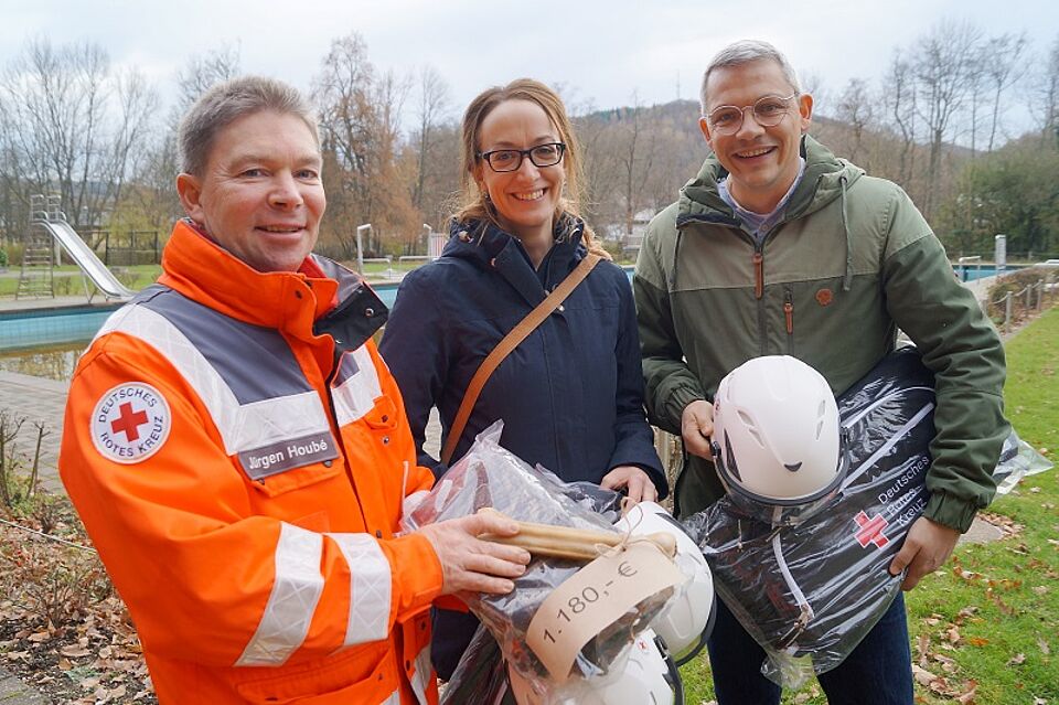 Eintrittsgelder aus Hundeschwimmen im Rosenbad Gemünd an Rettungshundestaffel des Roten Kreuzes im Kreis Euskirchen gespendet – Einsatzhelme und -taschen angeschafft