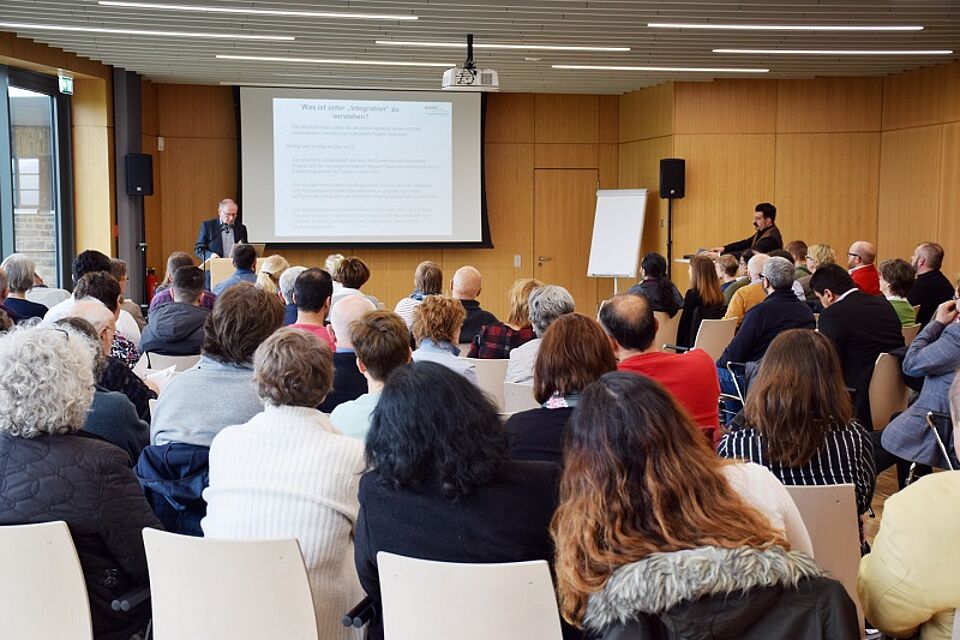 Die Veranstaltung stieß auf großes Interesse, rund 90 Teilnehmer trafen sich im Forum. Ehrenamtlich oder hauptamtlich Engagierte, geflüchtete und zugewanderte Menschen tauschten sich rege aus.