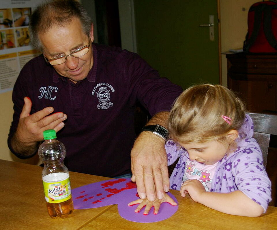 Das zweijährige Projekt „Die neuen Großväter in Aktion“ entwickle sich bislang qualitativ und quantitativ gut und solle im kommenden Jahr intensiviert werden. „Es ist vom Generalsekretariat als erfolgreich eingestuft worden.“ Die Großväter-Arbeit des Euskirchener Kreisverbandes lobte Dr. Mosemann als „Leuchtturm“. Auf dem letzten Stück der Wanderung hatten die Kinder und Opas Zuwachs bekommen. Vom Bundesverwaltungsamt, das das Projekt administrativ unterstützt, waren Michael Impertro und Franz Wozniak nach Vogelsang gekommen. „Aus dem hohlen Bauch heraus gesagt: Ich fand es klasse“, zeigte sich Michael Impertro ganz angetan. Franz Wozniak erklärte, solche Projekte seien wichtig für das Verständnis zwischen den Generationen. Das entwickle sich schließlich von klein auf. Eine bleibende Erinnerung gab es am Schluss für beide Generationen. Tina Mertens hatte Papp-Herzen vorbereitet, auf denen Opa und Enkel je einen farbigen Handabdruck hinterließen. Die Herzen werden ihren Platz in der Kita finden.