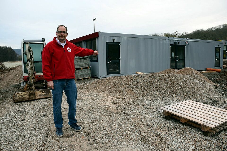 DRK-Bereichsleiter Ralf Krutwig zeigt auf die rot „markierten“ Container. Dort werden im März rund 80 Kita-Kinder des Roten Kreuz im Kreis Euskirchen aus Gemünd-Malsbenden und Gemünd-Kreuzberg für etwa zwei Jahre einziehen, deren Kitas nach der Hochwasserkatastrophe abgerissen werden müssen. Foto: Kirsten Röder/pp/Agentur ProfiPress