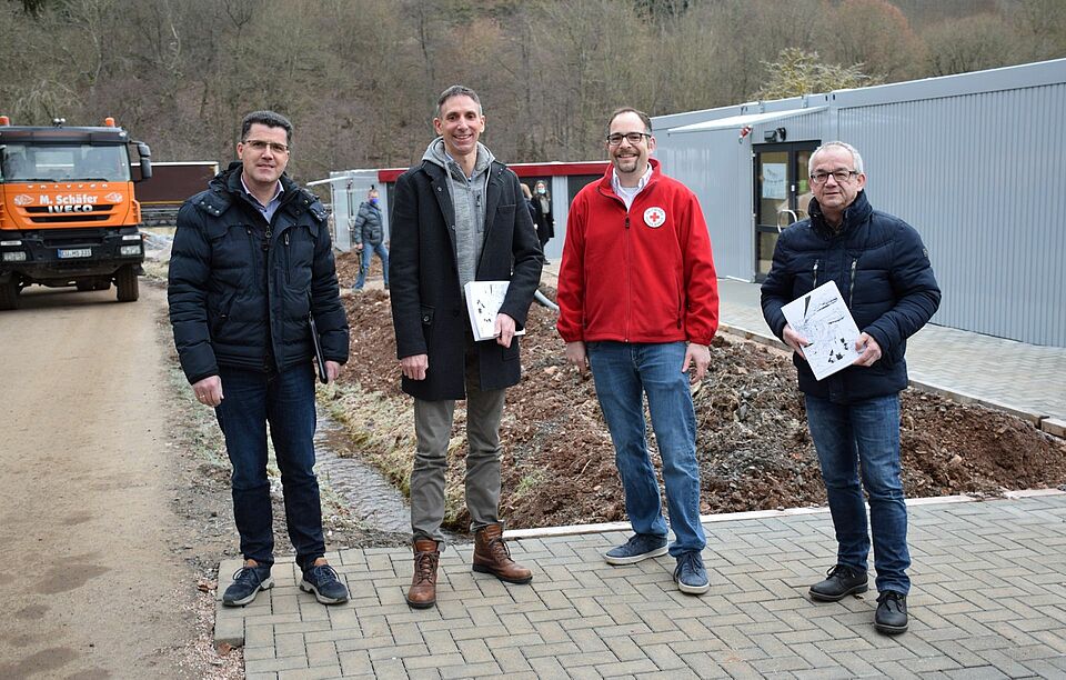 Stellten den neuen Kita-Container-Standort in Olef vor, v.r.: Thomas Pick (Profinos), Ralf Krutwig (DRK Euskirchen), Marcel Wolter (Erster Beigeordneter Stadt Schleiden) und Armin Fischbach (Teamleiter Liegenschaften/Hochbau). Foto: Kirsten Röder/pp/Agentur ProfiPress