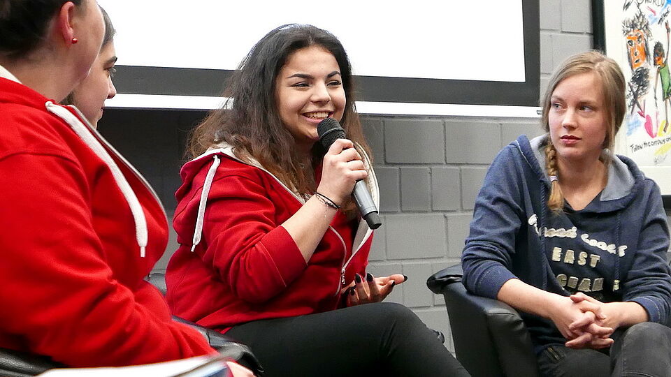 Dann machten die Jugendrotkreuzfrauen Laura Zimmermann, Jasmina Engel und Sultan Gümüs, die Slam-Poetin Sarah Kersting und Rotkreuz-Akademieleiter Simon Jägersküpper dem begeisterten Auditorium und Moderator Manni Lang deutlich, dass sie die Power haben, auch mit kleinen Dingen und guten Gesten jeden Tag aufs Neue die Welt ein kleines bisschen besser zu machen.