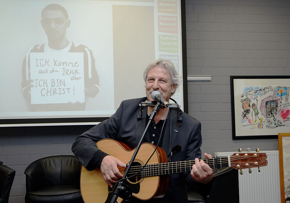Zwischen den Talkrunden, am Anfang und nach dem Ende des offiziellen Teils sang und spielte Eifel-Troubadour Günter Hochgürtel für die internationale Gästeschar, zu der auch Rotkreuz-Kameraden aus Benelux gehörten. Tiefen Eindruck hinterließ die Slam-Poetin Sarah Kersting, die in einem literarischen Block tiefsinnige und sinnsuchende Texte vortrug.