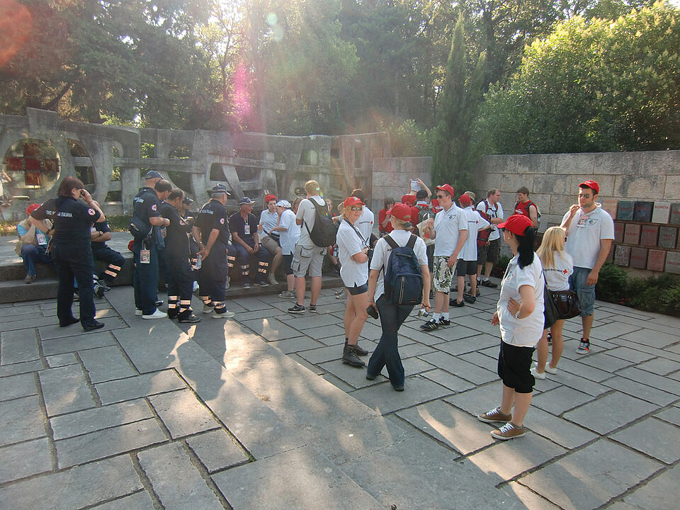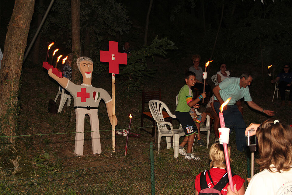 Auf dem Platz oberhalb des Dorfes treffen sich die meist jungen Rotkreuzler. Von dort aus besichtigen sie das Rotkreuzdenkmal, bestaunen die Wand, an der alle Staaten verewigt sind, die die Genfer Rotkreuzabkommen unterzeichneten oder steigen auf den Turm oberhalb, von wo aus man einen unglaublichen Blick über das Land und auf die ehemaligen Schlachtfelder hat.