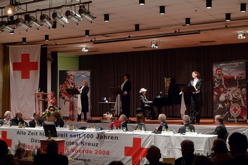 Gastgebende Gemeinschaft war in diesem Jahr die Bereitschaft Voerde, die ihr 100-jähriges Bestehen feierte. Aus diesem Anlass war eine interessante Ausstellung zum Thema "DRK gestern und heute" vor der Versammlungsstätte im Schulzentrum aufgebaut.
