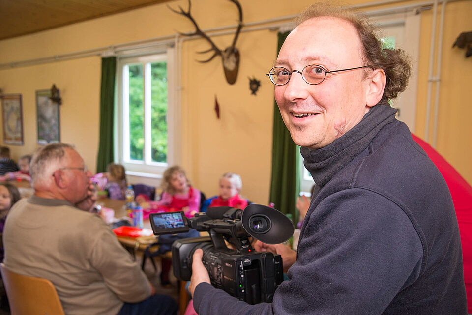 Vogelsang - Von Herhahn aus wanderte der dortige Kindergarten zusammen mit vielen Großvätern nach Vogelsang. Im Jugend-, Natur- und Umweltbildungshaus „Transit 59“ des Roten Kreuzes auf dem Gelände der ehemaligen NS-Ordensburg fanden die jungen und alten Wanderer erst einmal Zuflucht vor dem Regen. Immer mit dabei: Kameramann Ivo Tödtmann und seine Videokamera, der Kinder und Großväter ständig begleitete.