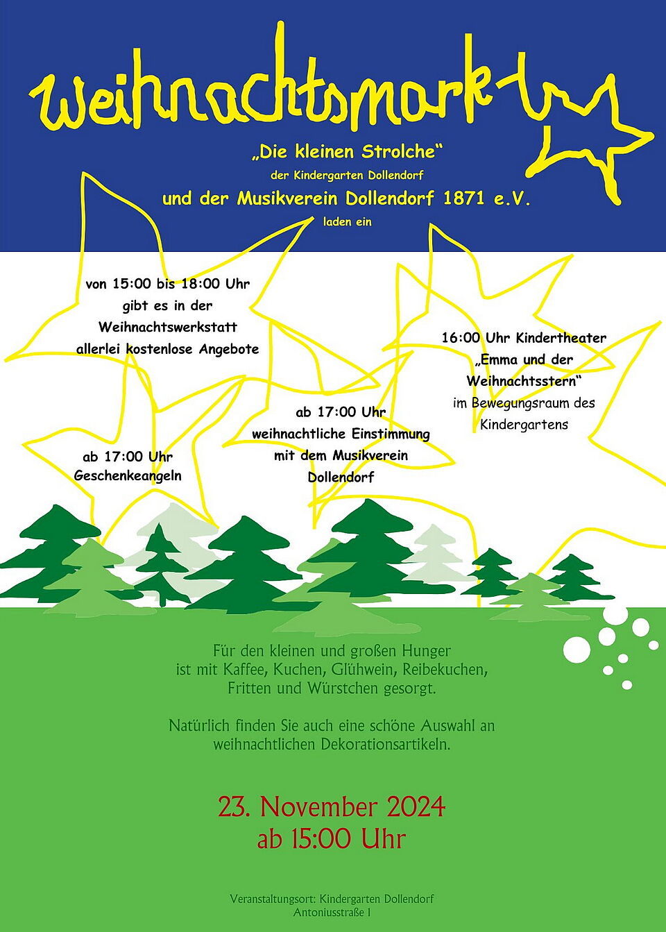 So gibt es von 15 bis 18 Uhr in der „Weihnachtswerkstatt“ allerlei kostenlose (Bastel-)Angebote. Um 16 Uhr bietet das Kindertheater „Emma und der Weihnachtsstern“ eine Vorstellung im Bewegungsraum des Kindergartens. Abgerundet wird das Angebot ab 17 Uhr mit einer weihnachtlichen Einstimmung mit dem Musikverein Dollendorf und großem „Geschenkeangeln“.