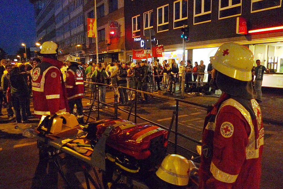 Nachdem wir zügig alles aufgebaut und eine kurze Einsatzvorbesprechung vollzogen hatten, waren wir auch schon einsatzbereit und warteten auf die ersten Hilfesuchenden. Diese ließen zunächst auf sich warten, da die Raver vom Bahnhof friedlich und geordnet zum Festivalgelände strömten. Im Laufe des Tages gab es aber dann doch einiges zu tun, wenn auch nie alle 3 Erst-Versorgungs-Trupps (3 Helfer, die Verletzte mittels Trage und Notfallrucksack zu einer Unfallhilfsstelle bringen) gleichzeitig zum Einsatz kamen. Vom Ereignis im Tunnel bekamen wir Informationen durch die Leitung der UHS mit der Anforderung, uns sofort einsatzbereit zu machen, um bei Notwendigkeit dort eingesetzt zu werden. Die Lage wurde als „ MANV“, also Massenanfall von Verletzten gemeldet. Da unsere Unfallhilfsstelle aber relativ weit vom Katastrophenort entfernt war, kamen wir nicht zum Einsatz am Tunnel. Wir hatten aber auch in unserer Unfallhilfstelle alle Hände voll zu tun. Viele, die bei der Massenpanik leicht verletzt wurden, suchten bei uns Hilfe und wurden dann versorgt. Überwiegend handelte es sich um kleinere Verletzungen, aber auch einige Drogen- und Alkoholvergiftungen mussten wir zusammen mit der uns zugeteilten Ärztin behandeln.