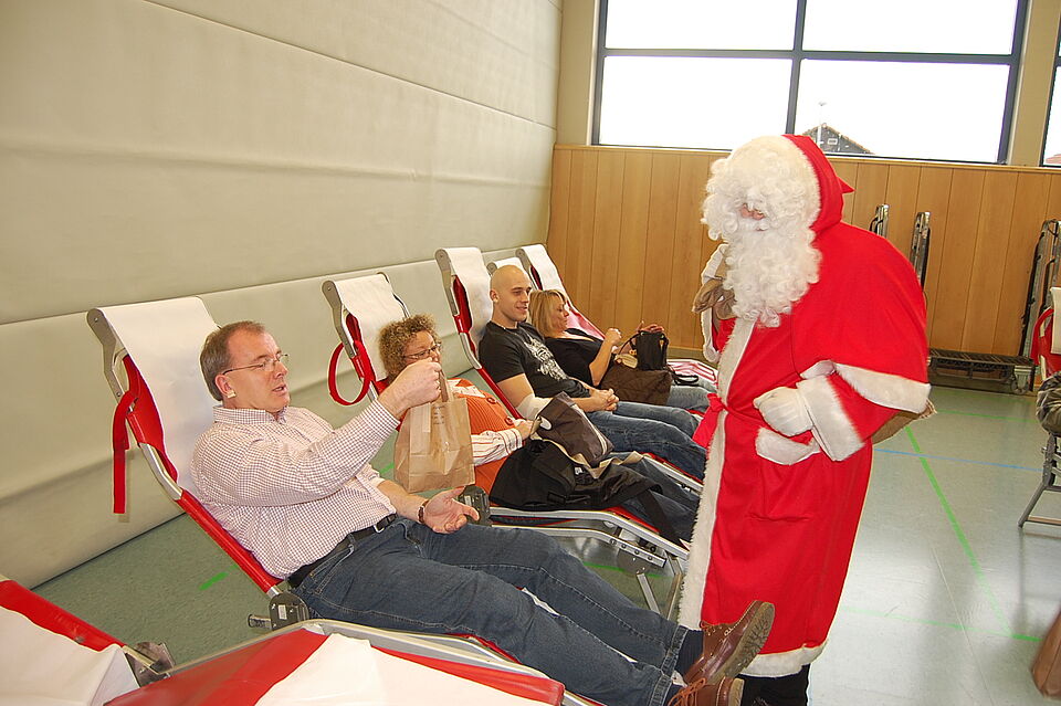 Die Füllung stellte das Rote Kreuz. Blutspendebeauftragter Günter Rose sagte dazu: "Wir wollen den Blutspendern am Ende des Jahres einfach nochmal Danke sagen." Der Nikolaus, der an diesem Tag noch viel zu erledigen hatte, beschenkte jeden Spender mit einer kleinen Überraschung aus seinem Nikolaussack.