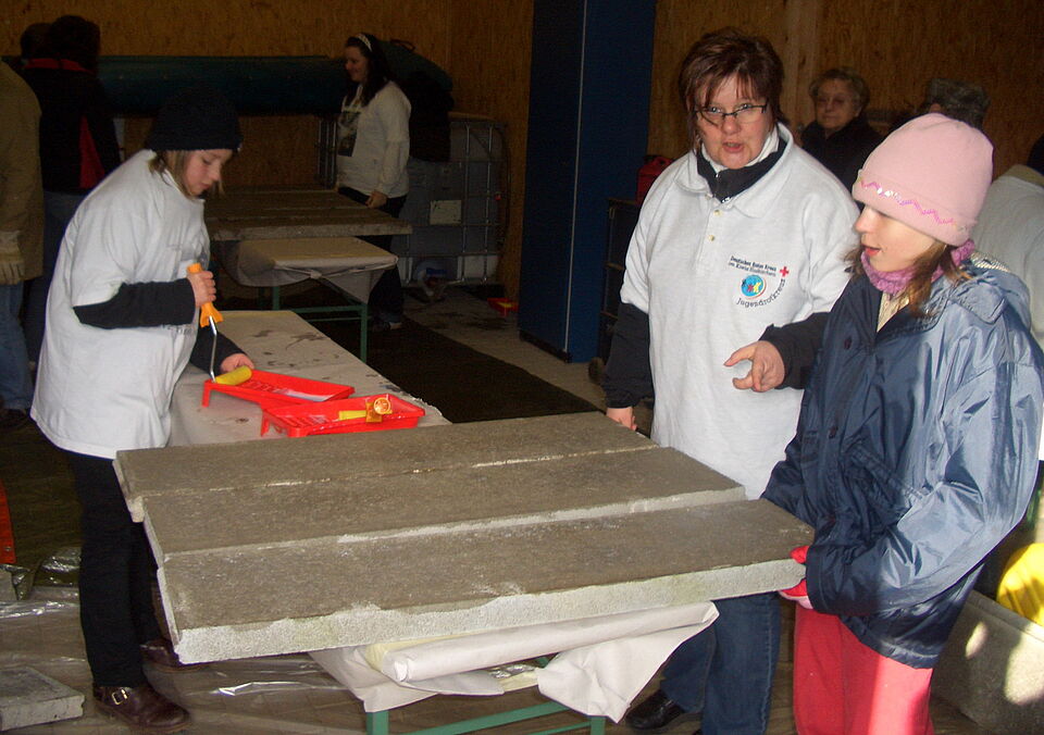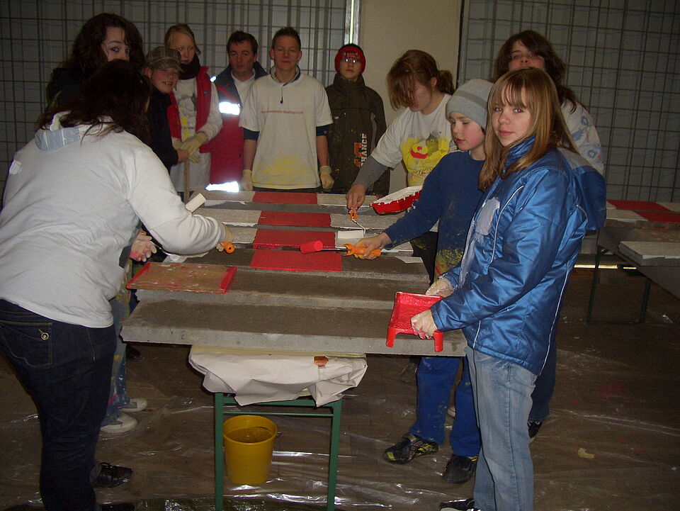 Insgesamt 100 Platten malten die 15 Jugendlichen an ( 50 in rot/weiß und 50 in gelb). Die Jugendlichen waren begeistert bei der Sache, wenn auch der ein oder andere Farbklecks zum Leidwesen der Eltern auf der Bekleidung landete.