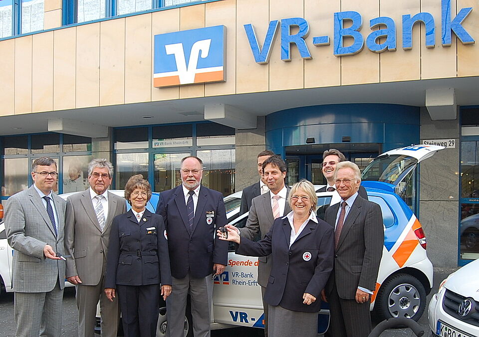 Hans Mahlberg, Vorsitzender des Vereins "Bürger helfen Bürgern", bedankte sich im Namen seiner Organisation für das Auto, das ab sofort in der haushaltsnahen Senioren-, Behinderten-, Jugend- und Krankenbetreuung eingesetzt wird. Auch Dr. Gerda Hirth und Günter Rose (Rotkreuz-Ortsverein Weilerswist) sowie Theo Mittelstaedt (Rotkreuz-Stadtverband Erftstadt) freuten sich, als ihnen die VR-Bank Vorstände Markus Bärenfänger und Christoph Kaminski die Schlüssel und Kfz-Papiere der VR-mobile überreichten.