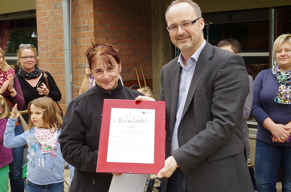 Weilerswist-Großvernich - Als erste Kindertagesstätte im Kreis Euskirchen wurde nun die Rotkreuz-Kita Kirchtal in Großvernich als „Ort des gesunden Aufwachsens“ zertifiziert. Das Zertifikat des Deutschen Roten Kreuzes überreichte Kreisgeschäftsführer Rolf Klöcker an die Kita-Leiterin Iris Böhme. „Es ist nicht so, dass sich der Rotkreuz-Kreisverband hier eine schöne Urkunde ausgedacht hat, sondern das Zertifikat kommt von unserem Dachverband“, erklärte Klöcker den Erzieherinnen, Kindern und Eltern.