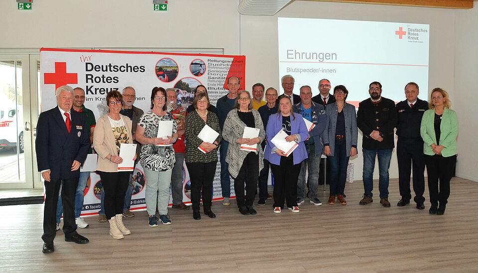 Doch auch große kommende Herausforderungen stellte er heraus. Ebenso waren Blutspenden Thema – mit ganzen 1337 Stück im vergangenen Jahr. Er freue sich sehr über das „vorbildliches Engagement“ der Spender und Helfer. Schließlich dankte er allen Freiwilligen, Führungskräften, öffentlichen Behörden und der Feuerwehr für die „gute Zusammenarbeit auf freundschaftlicher Ebene“, bevor die offiziellen Ehrungen anstanden.
