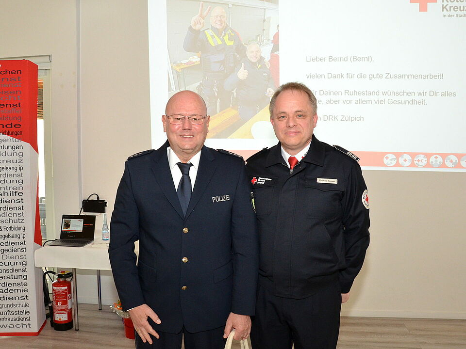 Bevor der offizielle Teil endete und das gemeinsame Mahl begann, verabschiedete Thomas Heinen noch einen „langjährigen Freund“. Denn Bernd Klein vom Bezirksdienst der Polizei geht in den Ruhestand. Heinen dankte ihm herzlich für die „stets gute Zusammenarbeit auf Augenhöhe“ und überreichte ihm schmunzelnd sein „letztes Lunchpaket“.