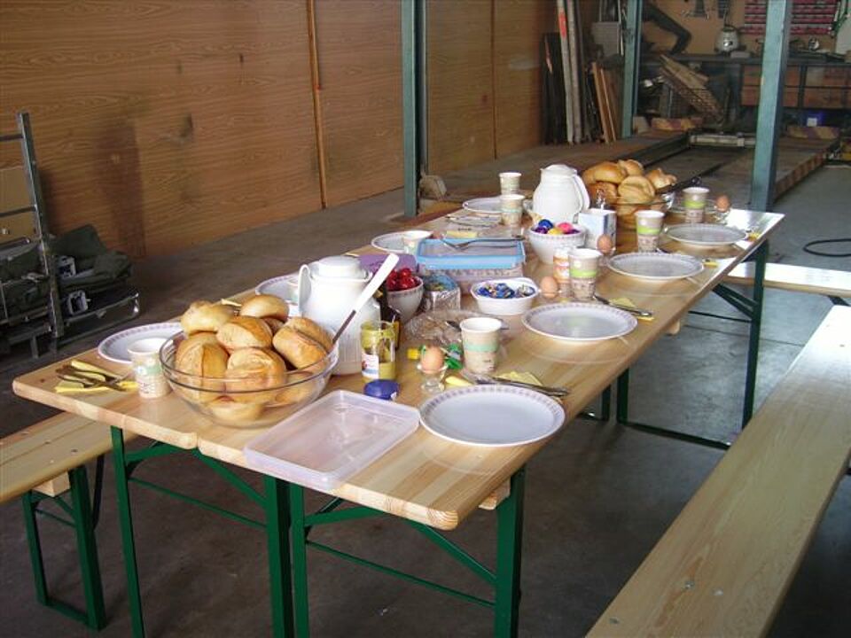 Bei wunderschönem sonnigem Wetter wurde der komplette Fuhrpark gereinigt, rettungsdienstliche Materialien wurden sortiert und auf ihre Haltbarkeit geprüft und die Helfer aus der Betreuungsgruppe brachten ihre Küche auf Vordermann, um alle Helfer für ihre Arbeit mit einem leckerem Brunch und ebenso leckerem Kuchen zu belohnen.