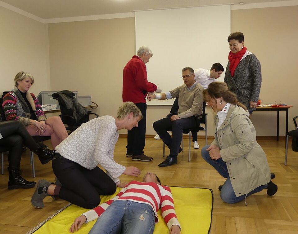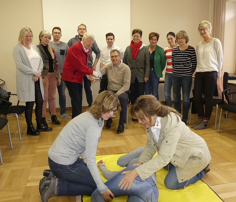 „Wer nicht hilft, der hat schon was falsch gemacht“, so lautete das Motto, das Bürgermeister Ulf Hürtgen seinen Mitarbeitern mit auf den Weg gab, um sich für einen Auffrischungskurs in Erster Hilfe anzumelden. „Oftmals ist es nämlich Unsicherheit, weshalb sich viele Menschen nicht trauen, Erste Hilfe zu leisten - etwa weil der eigene Erste-Hilfe-Kurs viel zu lange her ist. Dieser Auffrischungskurs soll den Mitarbeitern die Scheu davor nehmen“, so der Bürgermeister. Während dieses ersten Inhouse-Seminars im Zülpicher Rathaus hatten Beschäftigte aus Stadtverwaltung, Bauhof, Schulen, Kindergärten und anderen Außenstellen der Stadt Zülpich, die Möglichkeit ihr Wissen aufzufrischen und sich über Neuerungen zu informieren, wie sie im Notfall richtig handeln können. Unter der fachkundigen Anleitung des Rotkreuz-Teams um Daniel Larres, Leiter der DRK-Bildungsakademie, Ilona Raabe, der Bildungsbeauftragten des DRK im Kreis Euskirchen, und dem Vorsitzenden des DRK-Ortsvereins Lothar Henrich wurde unter anderem Verbände angelegt, beatmet und reanimiert. Auch das Erlernen von Sofortmaßnahmen, der Umgang mit Defibrillatoren und die richtige Wundversorgung waren Inhalte der Schulung. Mit praktischen Übungen wurden Notsituationen nachgestellt und veranschaulicht. Dabei konnte auch Bürgermeister Ulf Hürtgen unter anderem erfahren, wie man einen Wundverband richtig anlegt. Alle Teilnehmer waren sich einig, dass man einen solchen Kurs des Öfteren besuchen sollte, um in Notsituationen helfen zu können beziehungsweise um die Angst vor dem Helfen zu verlieren und um seine Erste-Hilfe-Kenntnisse auf dem aktuellen Stand zu halten. Insgesamt wurden drei Veranstaltungen dieser Art im Zülpicher Rathaus durchgeführt, eine weitere ist im kommenden Jahr geplant. Diese dreistündigen Crashkurse für potenzielle Lebensretter sind Teil der Kampagne „Ich schaue nicht weg - Ich kann Leben retten“, die der DRK-Kreisverband Euskirchen im vorigen Jahr ins Leben gerufen hat, um Mitarbeiterinnen und Mitarbeiter von Verwaltungen und Firmen, aber zum Beispiel auch Mitglieder von Vereinen das Rüstzeug für eine qualifizierte Erste Hilfe an die Hand zu geben. „Es ist toll, dass die Mitarbeiter der Stadt Zülpich hier eine Vorbildfunktion einnehmen“, sagte Ilona Raabe. „Damit wird die Botschaft »Jeder kann Leben retten - wenn er über die nötigen Kenntnisse verfügt« nach außen getragen.“