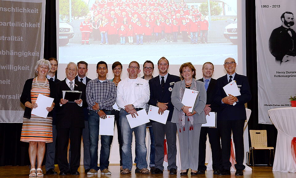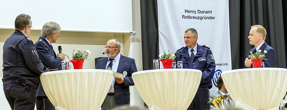 „Wir müssen immer und überall unsere Arbeit tun, wo sie notwendig ist“, sagte Schön, und bezeichnete seine Zuhörer und sich als Angehörige einer weltweiten Rotkreuz-Familie. Es sei an der Zeit, im wahrsten Sinne des Wortes die inneren und tatsächlichen Häuser zu verlassen und auf die Menschen zuzugehen, sagte Schön, der auch daran erinnerte, das bereits über 20 Angehörige der syrischen Rothalbmond-Gesellschaft im aktuellen Bürgerkrieg umgekommen sind. „Weil sie neutral sind, hält man sie willkürlich für Partei, je nach Blickwinkel“, berichtete Schön der Festversammlung: „In Syrien sind inzwischen bis zu hundert zum Teil rivalisierende Gruppen an den bewaffneten Auseinandersetzungen beteiligt“. Aber auch, wo die Lage keineswegs klar sei, müsse und wolle das Rote Kreuz ohne Ansehen der Person, der Religion und Rasse oder der Frage, wer recht oder unrecht hat, helfen.