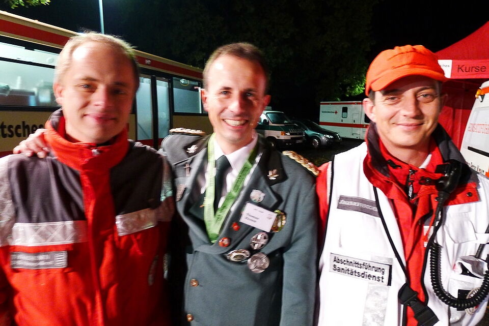 Bild DRK ZR | Gut gelaunte Schützen und Rotkreuz-Einsatzkräfte.