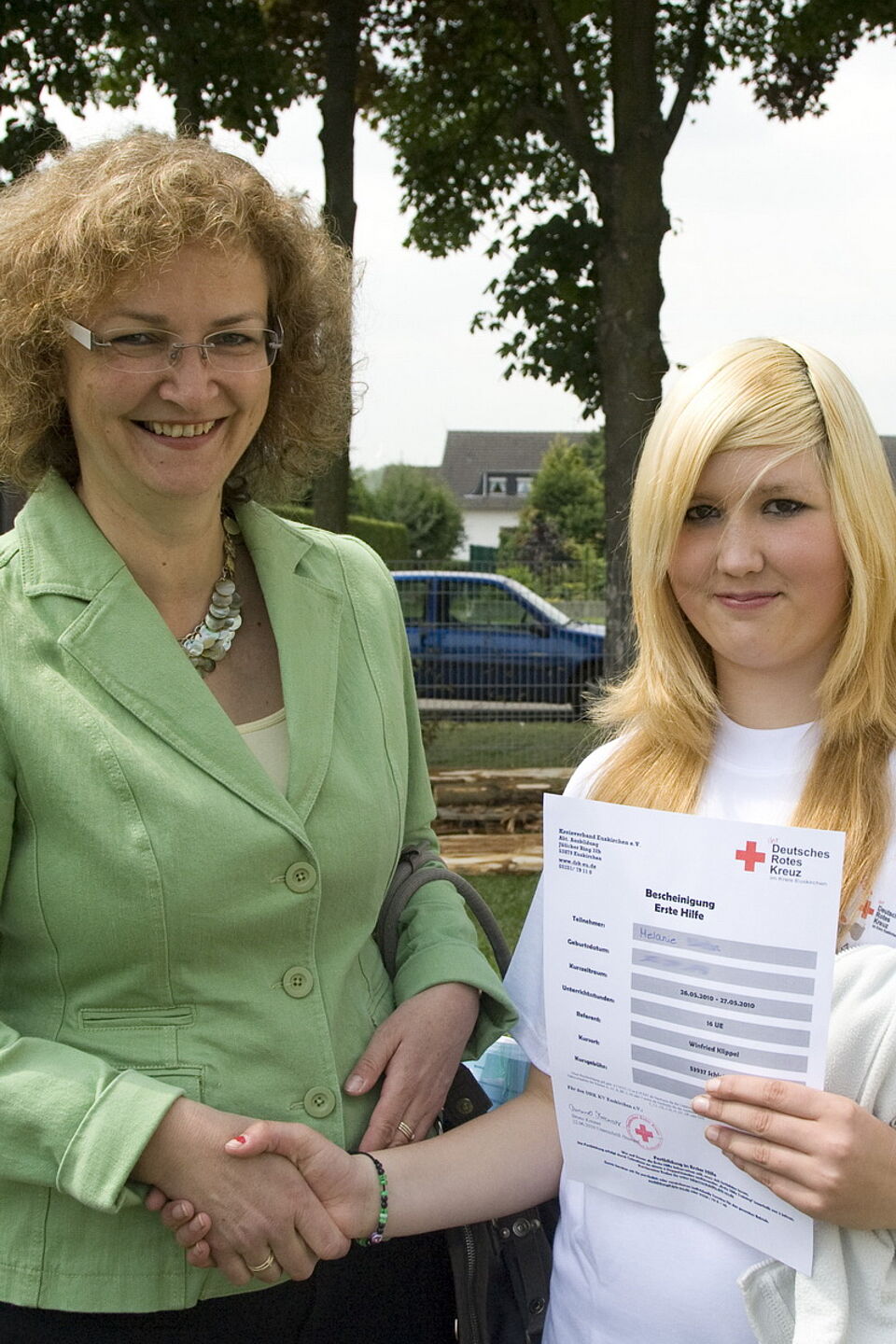 Gerhard Ohliger, Leiter der Zülpicher Förderschule, und Konrektorin Edeltraud Lorenzen betonten, dass die Schulung und Ernennung zum Schulsanitäter auch für das Selbstbewusstsein ihrer Schützlinge sehr wertvoll seien. Die Zusammenarbeit mit dem Roten Kreuz lief so gut, dass mehrere Schüler gleich zum Jugendrotkreuz gekommen sind. Lorenzen: „Eltern legen oft sehr großen Wert auf Rechnen oder Schreiben, auch an den Regelschulen. Aber das nützt im Notfall nichts, da sind soziale Kompetenzen gefragt.“